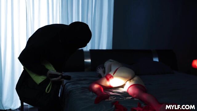 Description:Aalyah’s husband has to travel for work but she’s left home alone feeling horny as fuck! She goes to bed wearing sexy lingerie and expecting her husband to come back home and fuck her in the middle of the night. Meanwhile, a burglar sneaks into the house and starts bagging a bunch of valuables before he finds Aaliyah’s pussy just laying there. Aaliyah thinks it’s her husband and starts sucking his cock but while he goes down on her she realizes it’s a stranger! He doing such a good job that she just let’s him fuck her until she gets a creampie!