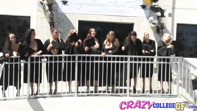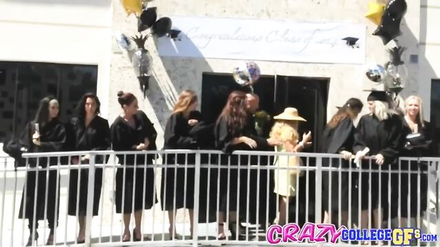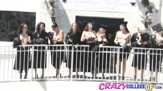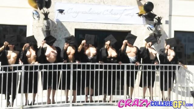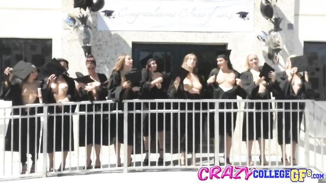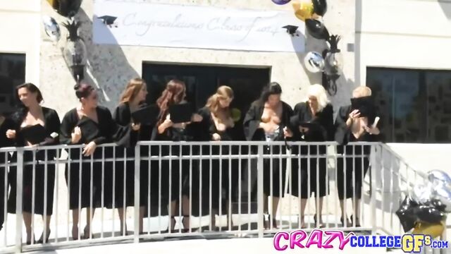 Description:This camera man was quite the suave, as he convinced all these sexy college girls to get topples for a graduation picture to remember. He tricked them while he actually recorded them and got some live action of all their hot tits bouncing around. After the so called group picture, the crazy couple in our submission celebrated their graduation day with some extreme action. The girlfriend, Alex, wanted to suck her man's dick as a little graduation gift. She didn't want to wait though, so Alex went ahead and started blowing him right there in the parking lot. She was a naughty college girl that needed her fix of cock. With friends and family just a few short feet away, Alex popped her big titties out, got on her knees, and wrapped her lips around his cock. They got busted in a few minutes by one of the sexy grads. Even though, they expected it since people were walking all around them, that didn't stop them. Alex continued slobbering on his hard dick-ploma before he got into that HOT college pussy. They got even ballsier and fucked right on the hood of somebody's car. It was surprising that the crowd didn't notice. Although, the streaking chick that was running around probably help distract them. Alex's BF blew his load all over her pussy and some got on her gown which evoked some panic as they took off to clean up. They went out with a crazy bang for the party!