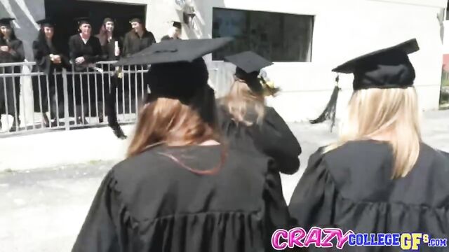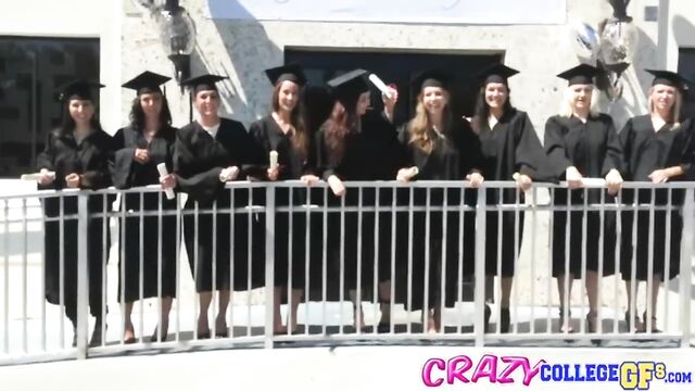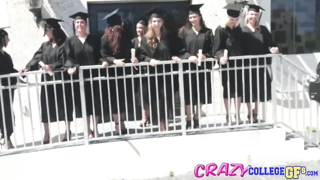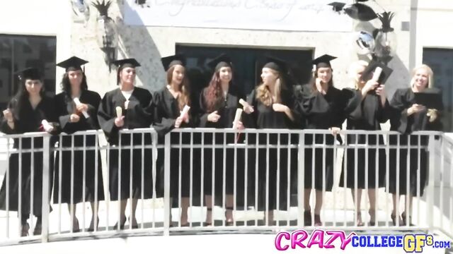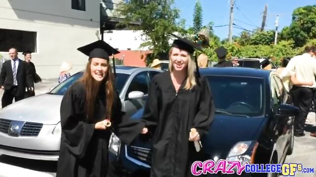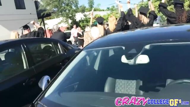 Description: This camera man was quite the suave, as he convinced all these sexy college girls to get topples for a graduation picture to remember. He tricked them while he actually recorded them and got some live action of all their hot tits bouncing around. After the so called group picture, the crazy couple in our submission celebrated their graduation day with some extreme action. The girlfriend, Alex, wanted to suck her man's dick as a little graduation gift. She didn't want to wait though, so Alex went ahead and started blowing him right there in the parking lot. She was a naughty college girl that needed her fix of cock. With friends and family just a few short feet away, Alex popped her big titties out, got on her knees, and wrapped her lips around his cock. They got busted in a few minutes by one of the sexy grads. Even though, they expected it since people were walking all around them, that didn't stop them. Alex continued slobbering on his hard dick-ploma before he got into that HOT college pussy. They got even ballsier and fucked right on the hood of somebody's car. It was surprising that the crowd didn't notice. Although, the streaking chick that was running around probably help distract them. Alex's BF blew his load all over her pussy and some got on her gown which evoked some panic as they took off to clean up. They went out with a crazy bang for the party!