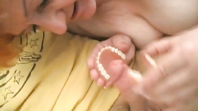Description: This redheaded granny doesn't have any real teeth, so her new male friend has some fun by taking out her dentures and placing them on her hairy vagina, as if it had teeth of its one. Its a fun time for both involved, and he ends up coming in her mouth.