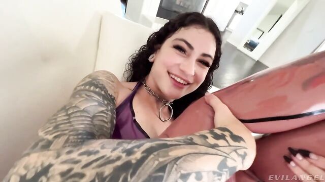 Description: Curly-haired, cute Lydia Black, resplendent in a sexy latex fetish dress and latex stockings, meets XXX director/performer Mick Blue for a private date. The accomplished pornographer's POV camera captures their intimacy. Tattooed Lydia pops out her tiny, natural tits for Mick (and viewers) to ogle. Lydia fingers her fat pussy lips as Mick drizzles clear lube over her hairy twat. She kneels to give him a fervent blowjob, making eye contact with the camera. Lydia deepthroats Mick's meat until she chokes and spits. She rims his asshole with deviant expertise. A massive, slickened dildo opens her rectum. Mick shoves his big cock up her ass and delivers an anal reaming. Lydia sucks his bone ass-to-mouth. She masturbates her clit while he bangs her butthole some more. The hard action boils over when she two-hand strokes Mick's dick to orgasm. He coats her tongue and cheek with a spermy cum facial.