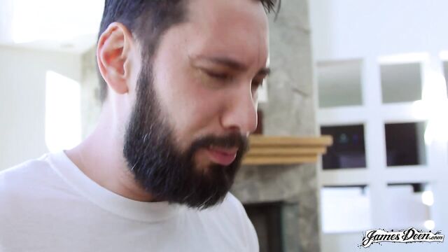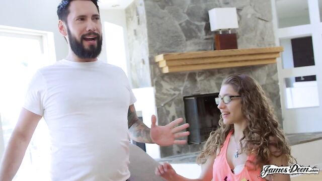 Description: Rebel Lyn sits on a chair inside the house talking to someone off the screen. She is wearing a salmon pink nerdy t-shirt and very short shorts. She is also wearing a pair of glasses, though it is unknown if it is prescription glasses or just for show. Her permed blonde hair reaches the middle of her back and she wears it beautifully. Rebel explains that she had a crush on Superman during her teenage years. She also confesses that she still feels some butterflies on her stomach when Superman becomes the topic of conversation. She paused and perhaps for a moment she expected Superman hiding somewhere within the house. None came, because we don’t have a superman, instead, we have Tommy Pistol. Tommy is a bearded muscular guy wearing a checkered button-down with a white undershirt on. He quickly discards his checkered shirt, while Rebel removes her glasses. Rebel went down on her knees and took his hardening cock into her mouth. Rebel licked the tip of his cock before wrapping her lips around the head before finally going down his full length. The semi-hard cock hardened instantly at her ministrations. She smiles coyly before taking his cock past her gag reflex. She deepthroats him while looking teasingly into his eyes. She happily gives him a blowjob. She then licks her balls before sucking them. Still, on her knees, Rebel Lyn grabs his big hard dick and puts it on her breasts. She rubs both of her tits on his penis, this time really hard as she feels his dick throbbing crazily. She suddenly stops, turns her back on the camera and bends down. She puts one hand on her ass with one finger stroking her clit and the walls of her pussy while the other supports her weight. James now sits on a step of the staircase. She hops on top of him in a face-off position, puts his dick in contact with her pussy with the tip placed in between her butt cheeks. She rides Tommy hard, back and forth. Rebel Lyn gets between the legs of Tommy Pistol and she lets him jerk off to her face until he comes and dumped his load onto her face.