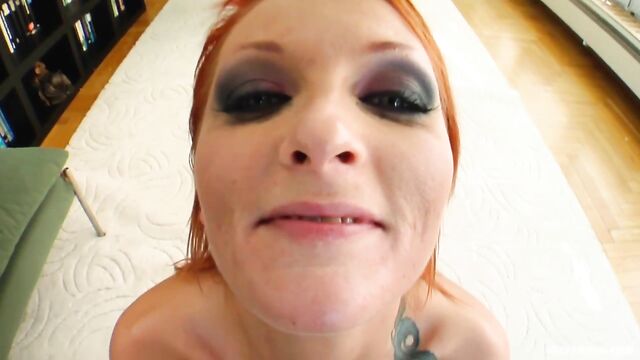 Description:With a tattoo across her chest and bright red hair, Leonie fell in love on our set with two cocks. She loved getting her ass pounded hard and her face covered in sperm.
