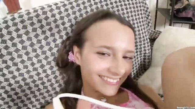 Description: Don't you just find the sight of a luscious teen innocently reading her magazine just damn irresistible? Lounging on the couch, wearing a miniskirt that totally does not cover her booty, we get an extreme upskirt shot of her sexy pink panties. She turns her head back and smirks as she juts her beautiful teen ass in the air. Yanking up her thongs so that they're caught in her pussy lips, I don't know about you, but this brunette cutie has got me on tilt! The action escalates. You won't believe how dripping her twat gets when she starts slappin' her flap!