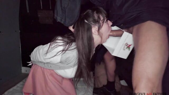 Description: The other night, I approached this sexy woman standing by herself at the side of the road. She explained that she had missed the bus and was waiting for a ride back home. I told the pretty brunette that I wasn’t really a priest and offered her 500 euros if she would be willing to partake in a confession. She agreed, and once we were inside the van, the tatted-up stranger promised that she had been extra good this year, so I treated her to a special present – my long, thick dick! I face fucked the slim babe, and after pulling aside her thong, I saw that she was wearing a butt plug! I stuffed her loosened hole with my cock in doggystyle position, then the flexible slut put her legs behind her head so I could give her a hard anal pounding in missionary while she stimulated her clit with a vibrating sex toy. After some spooning, the busty nympho sat on my lap and bounced on me cowgirl-style, then she gave me another blowjob until I came in her mouth!