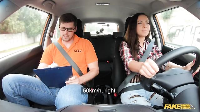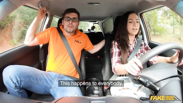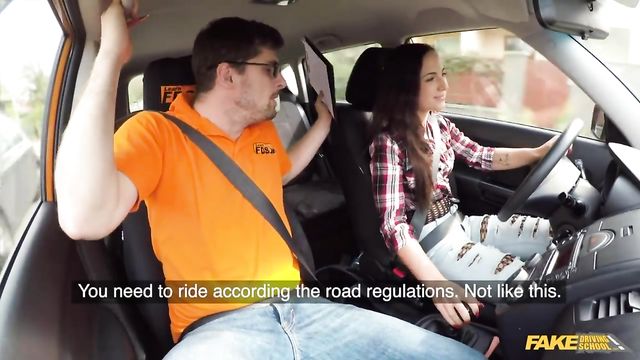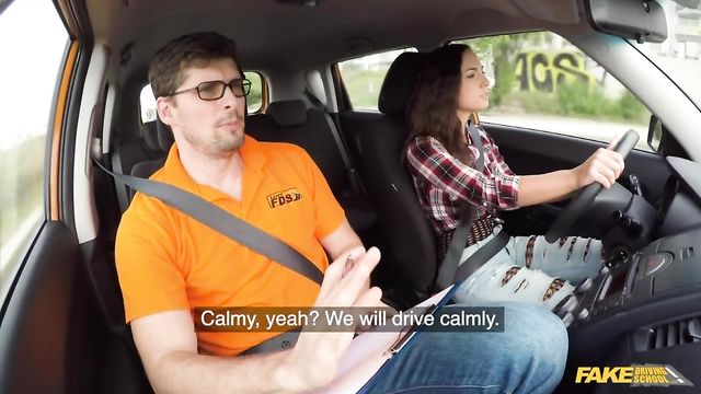 Description: I had an innocent looking brunette as a student today, a woman named Kristy Black, but my assumption based on her looks couldn't have been more wrong! Kristy told me she had taken 30 lessons, so I trusted she would know how to operate the car. What should've been an easy lesson began with a rocky start when she stalled the car. We got onto the road and she was driving way too fast, and when I heard police sirens behind us, I demanded she pull over. She didn't listen! Kristy kept speeding along, and I was getting scared. By the time she finally pulled over, I was scared out of my mind! The danger made Kristy horny, so she leaned over and slapped me, then started sucking my dick! After the blowjob, she took off her shorts and opened her fishnet bodysuit to show me her pierced pussy. Kristy rode me in the front seat, then I fucked her missionary style in the back seat. After some standing doggystyle outside the car, Kristy got on her knees, and took my load on her face!