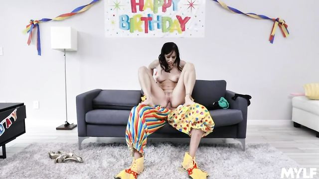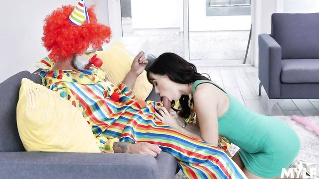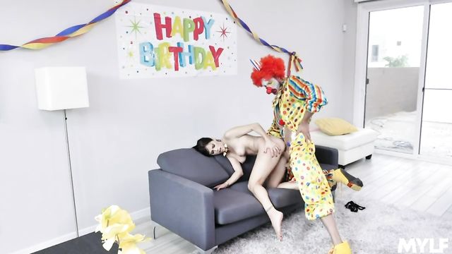 Playful brunette with natural tits Alana Cruise fucks with a clown