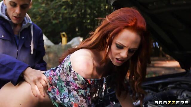 Description:Ella Hughes and her friend are left stranded when their car breaks down. They call for help and Chris Diamond is the lucky guy who gets to assist them during their time of need. Ella can't help but check out her knight in shining armor (and the big cock he appears to be hiding under his coveralls!). When her friend offers to pay for the gas the rest of the way if she can manage to get the car fixed for free, Ella gladly accepts the challenge. The sexy redhead puts her perfect ass on display for Chris, who quickly puts his hands to work, peeling off her tight booty shorts and fingering her wet pussy before the two have hardcore anal sex outdoors!