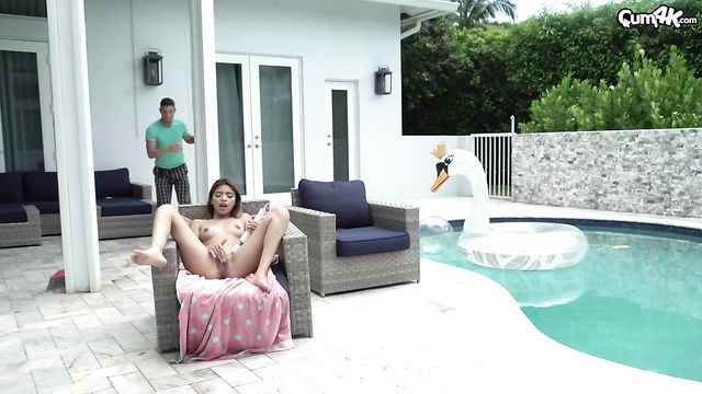 Description: Stepbro creeps on his stepsis as she masturbates in the backyard and can’t believe how wet her pussy is.