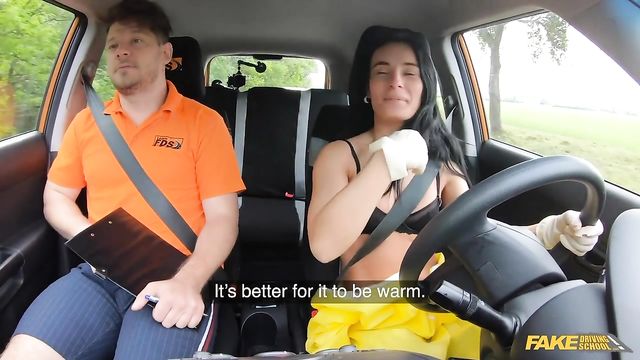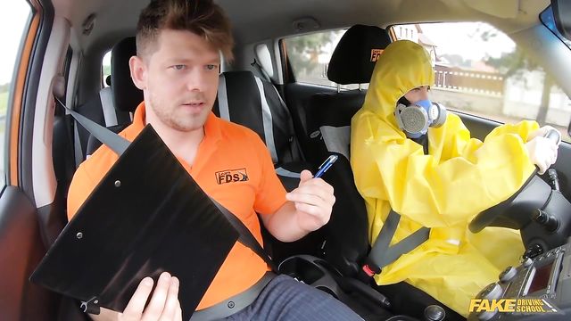 Description:Now that restrictions have eased up, I was able to start giving lessons again. My student for the day was Lexi Dona. There was no way to miss her, because she was wearing a bright yellow hazmat suit! "Scared for her health," she said. Lexi was experienced enough, but kept complaining about the heat. The Mean Orange Machine has admittedly seen better days, and the AC is out. Lexi unzipped her suit and took it off her shoulders. I saw she was only wearing a naughty black bra underneath and I could see her perky tits, so I subtly took out my cock. I was so horny, so covering my cock with my clipboard, I had a wank. Lexi swerved, and reaching for the gear stick, she met my hard shaft. Enjoying this new shifter, Lexi suggested we pull over quiet, and soon enough, she was giving me a blowjob. Lexi rode my cock in the front seat, then I fucked her missionary in the back. Finally, I made her climax doggystyle on the car's hood, then came on her ass!