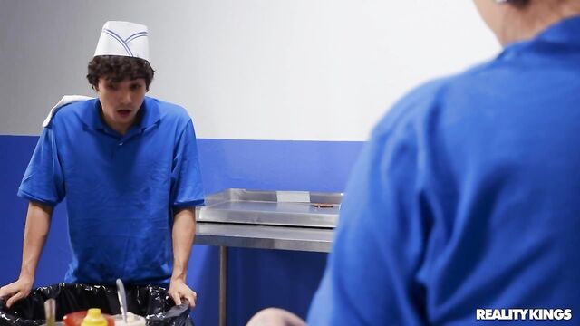 Description: The sexy Linzee Ryder goes into Lil Burgers hoping to get a quick meal to go. Unfortunately, she's at the mercy of horny new fry cook Ricky Spanish, who's more interested in humping the ingredients than actually finishing a burger. When Linzee marches into the kitchen and catches Ricky red handed with her lunch down his pants, she realizes the lil humper is too full of cum to do his work right and offers to help him take care of that.