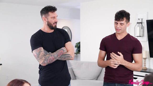 Description: What would happen if four families each contributed one member to create a new family? In this episode of Family Swap, Nickey Huntsman is cleaning up when her swap son Kai Jaxon comes to her for help. Kai tells his swap mom that his swap sister Megan Marx is really bugging him with her April Fools jokes. They agree that Nickey will tell Megan she's fucking her swap son.The prank backfires when Megan isn't phased at all. She announces she's fucking her swap dad, Quinton James. Quinton claims ignorance and Megan claims that it's an April Fools joke. The swap family begins arguing with Megan claiming that she knows Nickey and Quinton don't fuck. Frustrated, Nickey goes to Quinton and pulls his cock out to prove that she can too be sensual. Megan does the same to Kai. It turns out the girls both like what they see! They go to work blowing those nice cocks, with Nickey even giving a nice titty fuck.The girls tell the guys to take their seats on the couch, and both Quinton and Kai are happy to obey. Kai gets to enjoy his swap milf's tight twat riding him in reverse cowgirl while Quinton experiences his swap daughter's cooch in cowgirl. Switching spartners, Megan spreads her thighs for Kai to take her on her back while Nickey gets on her knees so Quinton can bang her in doggy. The ladies switch back to their original partners so that Nickey can get on her back for Kai until he gluts her with a creampie. Meanwhile, Megan takes a doggy style dicking down from Quinton until he gives her a matching creampie.