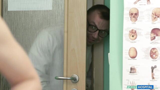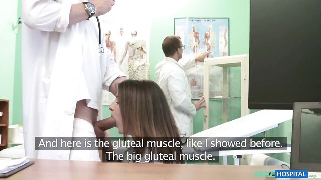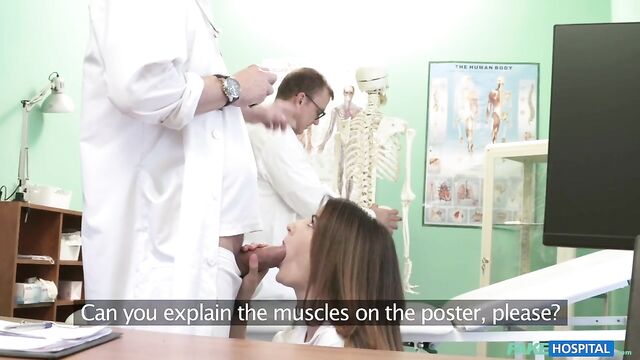 Description:Today two medical students came to test themselves in my office under my expertise and guidance: one male and one female. The female was a little hottie named Camilla Moon, who I'd had my eye on for a while: a cute brunette covered in tattoos--almost definitely naughty as fuck! While the male student was showing off his knowledge of anatomy using the teaching skeleton in my office, Camilla slid her hand on my ass, and looked at me with those adorable fuck-me eyes. Then as soon as she saw her opportunity, the little minx pulled my dick out of my pants and started sucking him, right behind the other student's back! He didn't catch us until I was fucking her doggystyle over my desk. But since I am the authority, I just sent him from the room, and kept on pounding away at that tight med student pussy!