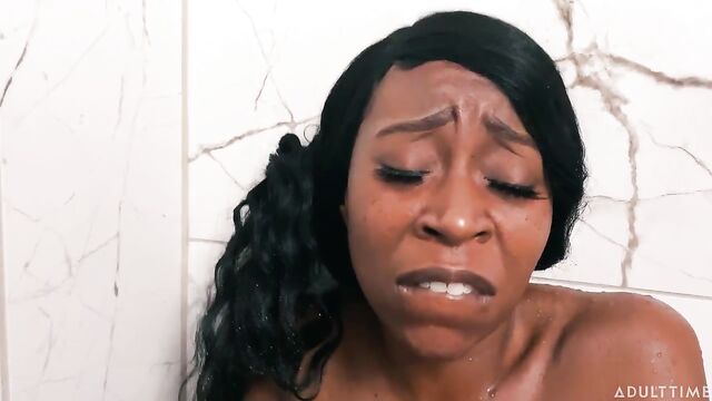 Cute ebony Mocha Menage is stimulating her pussy with a shower head