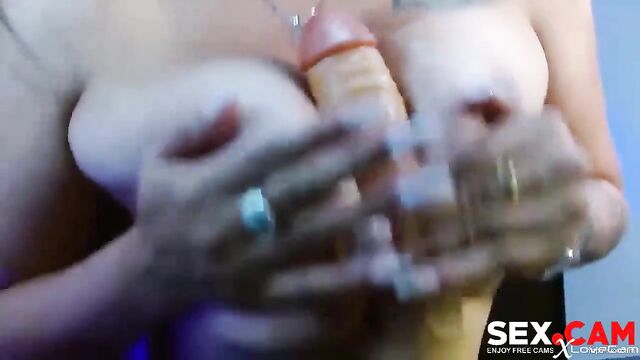 Tattooed brunette is sucking her lovely white dildo on the cam