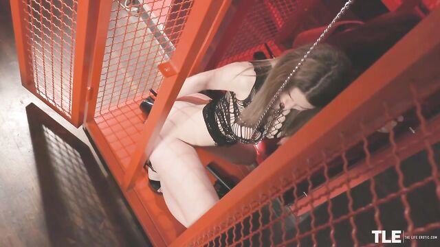 Description:Kinky Ukrainian submissive Kiere enters a sex dungeon, her slender curves encased in a tight net micro-minidress – her large breasts and stiff nipples are visible through the mesh. She teeters on high black ankle-strap heels, her long brunette hair is worn loose, and her lipstick is scarlet. She walks to a red-painted wire cage with a mirrored back wall, and finds a chain leash attached inside, which she clips to her collar.