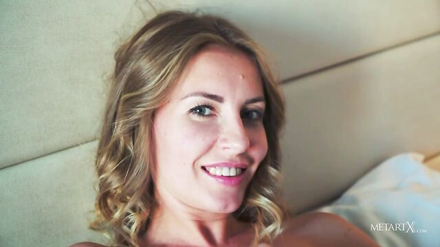 Description: Spied through the window, stunning blonde Bjorg Larson is rolling on her bed playfully, in a passionate mood. The blue-eyed Swedish bombshell beckons for you to come closer as she takes off her top and caresses her gorgeous breasts, her sweet pink nipples hard as diamonds. Tugging her panties aside, she strokes her clit, her naughty smile encouraging you to watch. She peels off her underwear and slides a finger into her shaved pussy, fucking herself feverishly and spreading her hot pink folds open to reveal the juicy pink interior. Moaning with pleasure, the horny beauty goes face down ass up as she masturbates to an intensely satisfying orgasm.