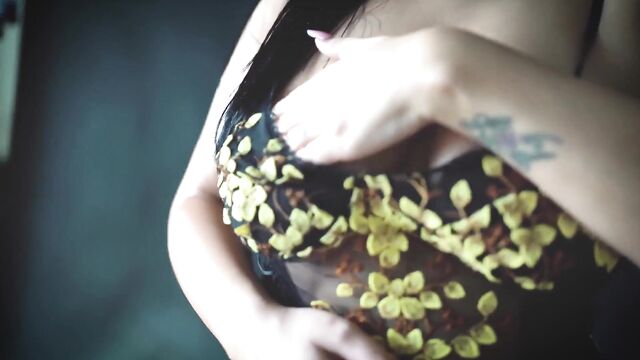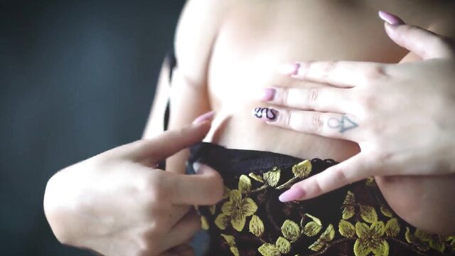 Spicy big-boobed babe sensually licking her lovely rubber dildo