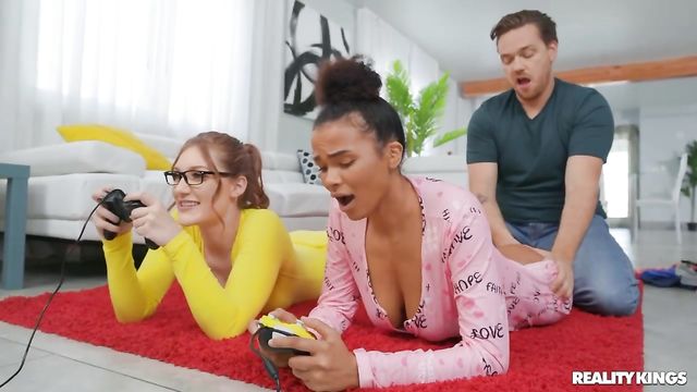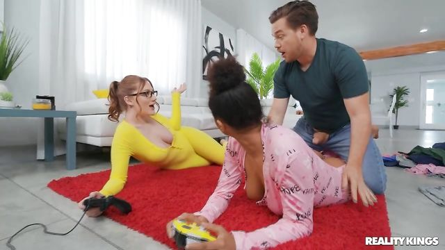 Description: When Kyle Mason returns from folding Alina Ali's laundry, he finds his girlfriend, Aria Kai, making out with and fingering Alina through her enticing onesie butt flap, while they play video games. Kyle is heartbroken until Alina invites him to take her open butt flap for a spin with his hard cock. Free-use sex ensues between Kyle and Alina, until Aria realizes she's been left out and demands Kyle fuck her hard as well. Eventually, gaming gets set aside for a full-on, intense threesome, which leaves everyone satisfied. But after all that, who's going to deal with the pile of laundry?