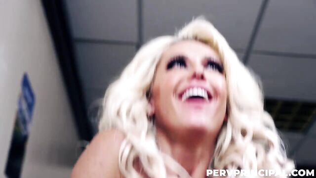 Description: Taylor is the school’s Chemistry teacher. The blond and innocent-looking milf is loved by her students, but she has a dark secret: she has been utilizing the chemistry room breaking bad style to make narcotics. Her husband’s health is not good and she desperately needs the extra money to pay off the family debts. Her plan seems to be working fine until Principal Rebel calls her into his office. The pervy headmaster has her on tape manufacturing illegal substances in the school’s promises, so Taylor breaks up and starts crying. She tries to explain the situation to him but Mr. Rebel cannot put up with it…unless she collaborates with him. Nicky loves striking filthy deals with the staff, and he has laid his eyes on Talyor’s huge tits a long time ago. He will get his share of Taylor’s illegal business, but he will also earn some interest by experimenting with Taylor. The poor teacher sits on the principal’s cock and calls her husband to tell him everything will be OK while Nicky fucks her.