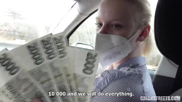 Description: Dear friends, lovers of sex for money, I've got a brilliant idea. I stood at a busy Prague crossroad and I was putting money behind the window wipers of cars driven by girls only. Quick money for free! It was adrenalin. After a while, I was sitting in a Skoda with two young chicks, a blonde Lenka and a brunette PƔja. One prettier than the other and both mad about money. PƔja was driving, so I started negotiating with Lenka. The lean blonde showed me her luxurious natural tits for 3k and for another 20k she shamelessly showed her wet pussy to me. She stuck her head out of the window and I fucked her from behind while the car was moving! Well, fuck me! The driver PƔja took us outside the city and I finished my artwork there. I bent Lenka over the car, fucked her hard, and cummed on her. The sexy brunette, instead of joining us, was filming the wild fuck on her cell phone and was giving me some bullshit about me cumming on her bumper. It was an incredible fucking ride. Look at that.