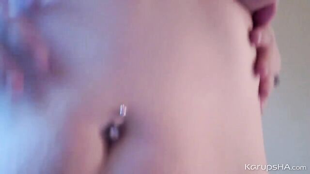 Sweet brunette Jessica Hilton nicely plays with her shaved pussy