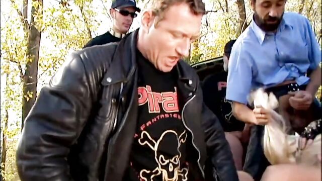 Description: Christina Blonde is outdoors and she's had some car trouble. As she waits, several guys on motorcycles pull over to help her out. She is soon surrounded by guys with their cocks out and she's sucking them off as good as she can. Her pussy and ass get filled with cock and she takes cum on her face.