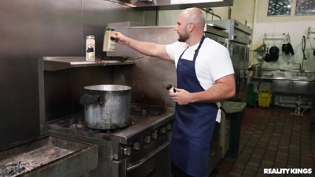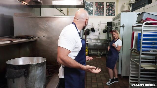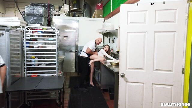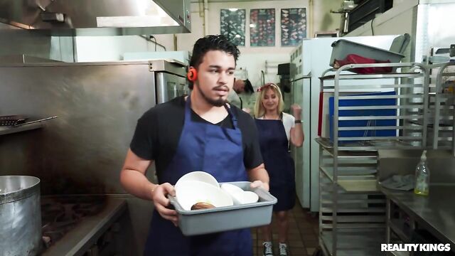 Description: Prep chef Katalina Kyle and waitress Selina Imai just can't keep their minds on their jobs. The babes flirt and take selfies in the kitchen, and Katalina beckons cook Jmac over to the sink, where she soaks her white shirt and sucks his dick. Jmac barely gets back to stirring his sauce when Selina offers him a taste of her juicy pussy, and he's fucking her over the counter when Katalina joins in to make it a staff meal. Dick for two!
