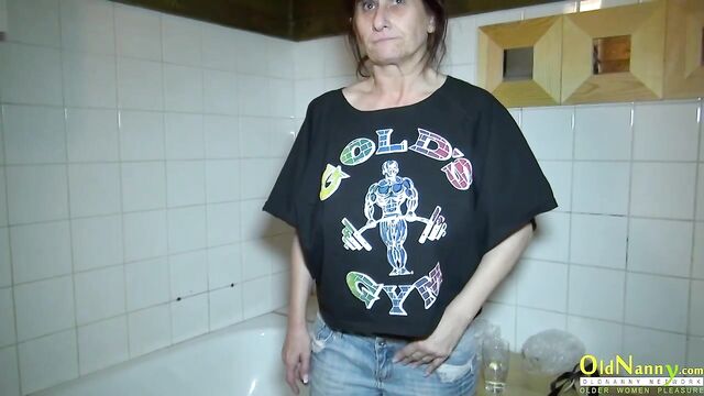 Lusty naked granny Vlasta plays with her hungry shaved pussy
