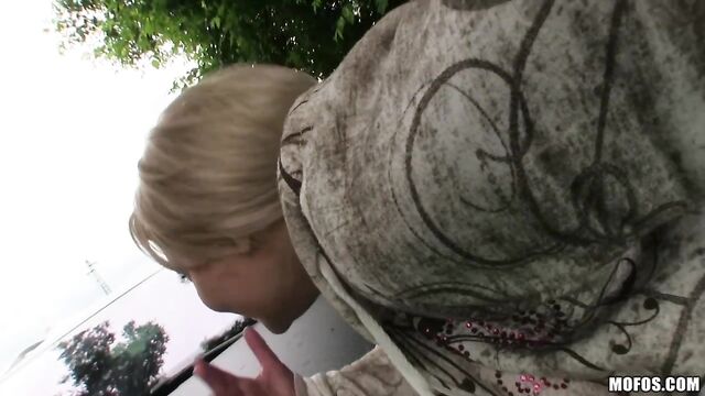 Description: Dude's approach is spot-on with this slut. First he convinces her that he's lost, and gets her to bring him to a park to film her flashing her sweet tits. Then for a few bucks, she drops down and sucks on his fat rod, dude gets all of it on film!