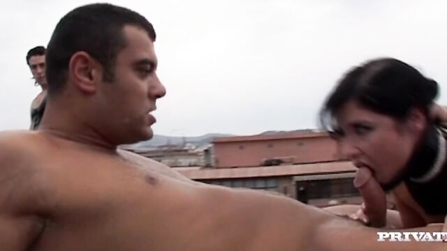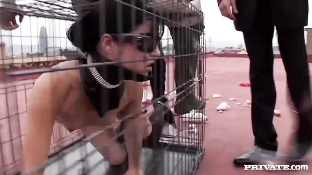 Description:Tiffany Hopkins is on the end of a leash and crawling along after her man. He signals for some helpers who bring over a large cage. After stripping her down to her lingerie she crawls into the cage. She sucks cock through the cage and then gets fucked in the pussy and ass before drinking their cum.