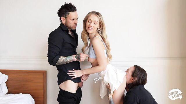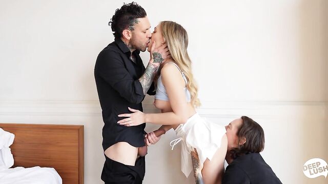 Description: After 5 years we reconnect with Sky Pierce for a fun and hot threesome. Small Hands and I can't help but put our hands all over her incredible body while we kiss, lick her pussy, and she strokes our cocks between us. We move to the bed and get undressed as Small Hands and I take turns fucking her. We bring in a hitachi and help give her multiple orgasms. The scene ends with Small Hands fucking her in missionary until he shoots his cum all over her body. I finish with having sex in missionary until I cum deep inside of Sky with a close up of my cum dripping out of her.