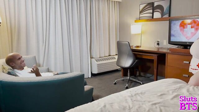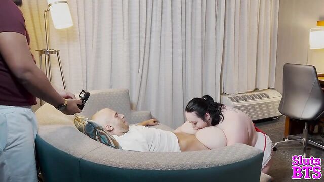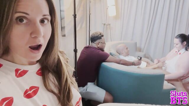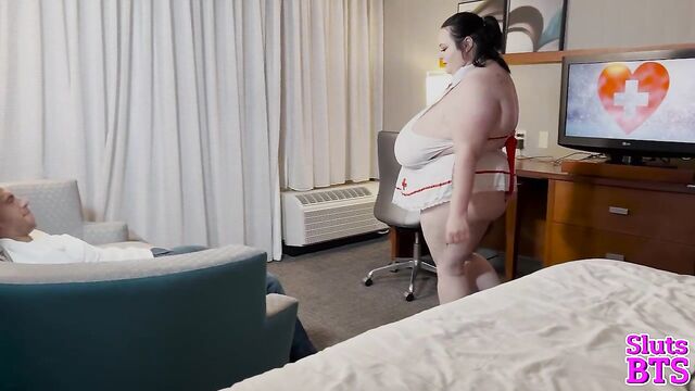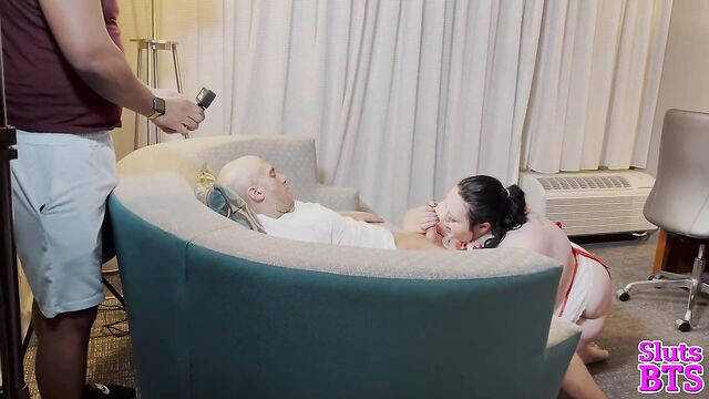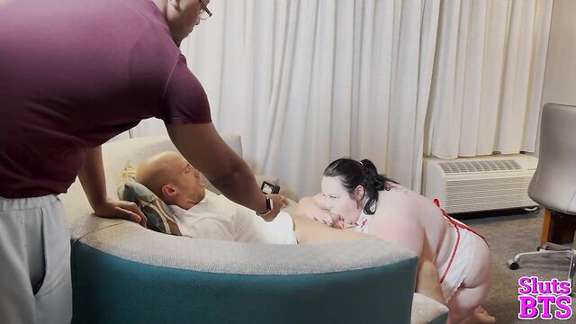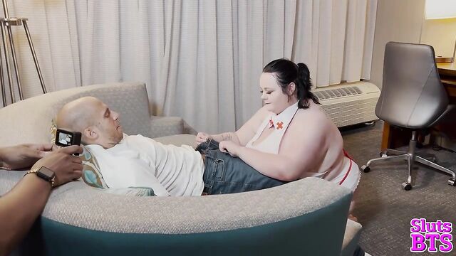 Description: Suzanne's camera captures the sultry scene - voluptuous nurse Peyton on her knees, her ample cleavage spilling from her uniform as she worships Dan Ferrari's thick, throbbing cock. Her full lips wrap around his shaft, sucking him with expertise as Finny's camera zooms in, focusing on the delicious sight of her tongue dancing along Dan's length. The room fills with the sounds of wet slurps and Dan's guttural groans, a symphony of pleasure that makes Suzanne's own body ache with desire. She pans out, revealing the entire erotic tableau - Peyton's round ass on display, Dan's strong hands gripping her hair, and Finny circling them like a predator, his camera hungry for every intimate detail.