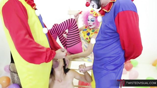 Description:Dana Vespoli is working outside today as a cab driver. She picks up her passengers only to be taken by surprise. Her three passengers are all dressed up as clowns. As they arrive at their destination, the three clowns invited her inside for some kinky sex. Yes, with all three of them roleplaying as clowns. Dana DeArmond, Mark Wood, and Steve Holmes bring Dana Vespoli inside their headquarters. Although Dana is hesitant, the three clowns still convinced her to come. The two guys take over and begin their sexy time with Dana Vespoli as the other, Dana, DeArmond that is watches. Dana Vespoli kneels on the floor, as Mark and Steve take their dicks out, letting her take one after another inside her mouth. She gamely gives both men a blowjob as Dana DeArmond takes off her Dana Vespoli’s clothes. Dana Vespoli is now naked and is positioned with her upper body bent on top of a high chair. The three clowns remained clothed with only the useful body part exposed. Dana DeArmond happily puts her on Dana Vespoli’s back as the men fuck. Steve thrusts his dick into her wet and tight pussy while Mark inserts his big hard dick into her mouth. The two men along with Dana Vespoli transfer to the couch and switch sex positions. Steve now lies on his back with his dick insider Dana’s ass hole. Mark, on the other hand, thrusts his big hard cock inside her pussy while Dana DeArmond gets a dildo and puts it on Dana Vespoli’s mouth. Dana DeArmond wants to fuck Dana Vespoli too. She uses the dildo and thrusts it inside Dana Vespoli’s pussy until all of them are almost at their peak. Steve Holmes fucks Dana Vespoli from behind as Mark Wood fucks her mouth. Dana DeArmond masturbates as she watches them. All of them orgasm. The men released their cum all over Dana Vespoli’s face, who looked really tired after being gangbanged by clowns.