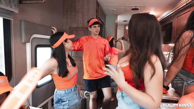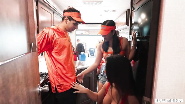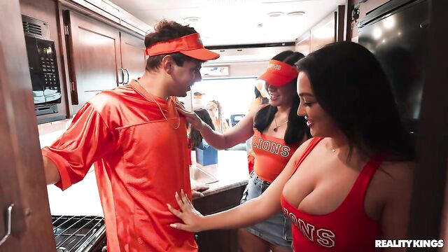 Description: Now that they're college seniors, this is Emerald Loves, Cassie Lenoir, and Lily's last chance to tailgate before they graduate, so they're going to make the most of it! The babes keep the energy up with booty- and booby-shaking chants, and when cutie Kai Jaxon boards the RV, Cassie and Emerald make sure he's very well taken care of. They sneakily suck his cock, then bring him into the bathroom to get dicked down. These sports fans like an audience, so they go back up front to fuck in front of the squad!