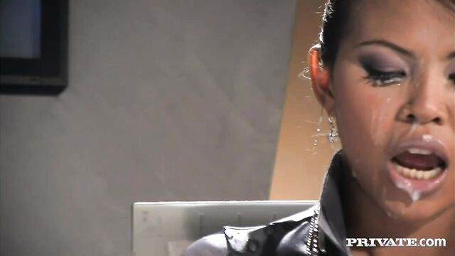 Description:While Sai-Tai sits behind the anchor desk, a guy walks up next to her and strokes his dick until he cums on her face. The lovely Asian woman delivers a few more lines only to have another guy show up and cum on her too. Her clothes are getting wet as several more facial cumshots are delivered.