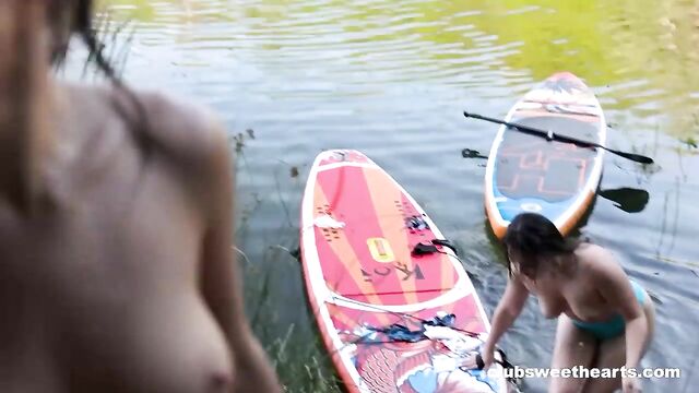 Description: In "Three girls, one SUP" our sweethearts Amelia, Dakota, and Sumiko paddle out on two SUPs, teasing and splashing until they can’t resist climbing onto the same board. Bikinis come off, kissing each other sensually, sliding their tongues over wet pussies right there on the water. The heat follows them to shore, where the girls finger, lick, and fuck until a very hot orgasm!
