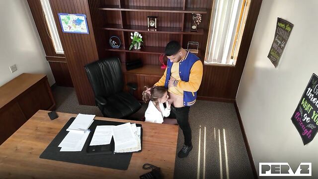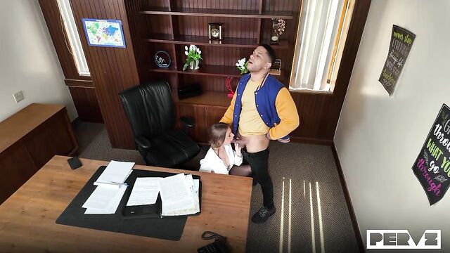 Description: Mike is absolutely convinced that Ms. Olsen is out to get him. Low grades, detentions, and all kinds of punishments are making this jockās senior year a living hellāand heās determined to get back at her, no matter the cost. One day, he catches Ms. Olsen engaging in inappropriate behavior on school grounds, and he secretly records the whole thing on his phone. Later, he confronts her in her office and tells her what he saw. Anya tries to brush him off with threats, but Mike shows her the footage. Now, her job is on the lineāand itās up to Mike whether she stays or goes. The horny student starts fondling her, giving him a clear idea of what he has in mind. Ms. Olsen plays along, striking a horny deal with her student, sealed with hot cum, to keep the whole incident under wraps.