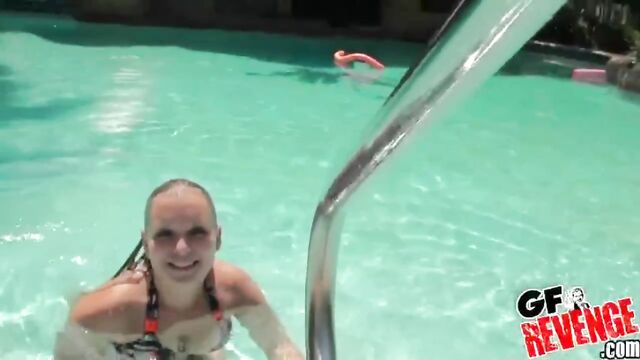 Description: This GF Revenge video started out in the best possible way, with a smoking hot blonde in a bikini. And from there, it just got better cause our beautiful and busty blonde ex took it upon herself to flash the camera her big luscious tits, as she came out of the pool dripping wet. But once the party started, it wasn't just her bikini that was wet. This babe dropped on all fours and started blowing her boyfriend until she was horny as hell and begging for cock. And did he ever give it to her. They went inside, he turned her around, and worked that pussy in doggy style until she was shouting out in ecstasy. And like every good loving BF, he finished by blowing his load on her face. Wow, this hot blonde really did know how to hide the pole!
