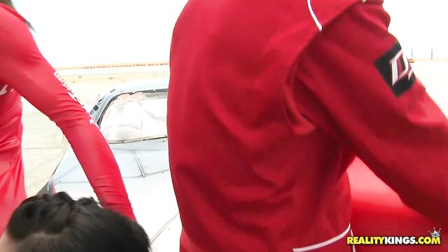 Description: Alexis, Bobbie and Frenceska received Voodoo after his victory lap with all the adulation that a champion deserves. Voodoo rightfully acknowledged that he would have never won the race without his pit man, so he shared the winnings with him. Voodoo and Br