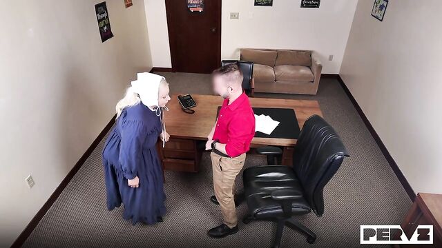 Description:I knew sending my stepson to a regular school was a bad idea. I wanted him to have more opportunities in life and to choose his path, but I didn't know he would fall into temptation so quickly. I got called by the school principal to tell me he has been ditching class for ice cream runs and movie theater sneak-ins. Then, my worst nightmare came to life. He told me that expulsion was the way to go. I couldn't let that happen! I was willing to do anything to keep him on the right track. According to the principal, the only way I can help him is if I meet him halfway and loosen up. When he stood up and massaged my shoulders, getting his strong hands so close to my tits, I knew what he meant. Letting him fuck me was not what I had in mind, but it's been so long since I've felt pleasure and when he raised my skirt and rubbed his fingers on my pussy, I got so wet I couldn't resist putting his cock in my mouth. I've never tasted one like that, and every drop of cum was making me wonder how it would feel inside me. All that was left to do was call my stepson while I rode the principal's dick to tell him everything was going to be fine.