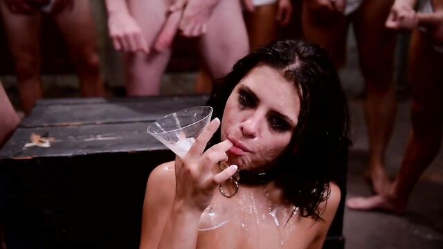 Bukkake cum swallow session with a hot brunette Adriana Chechik