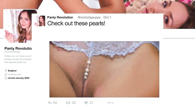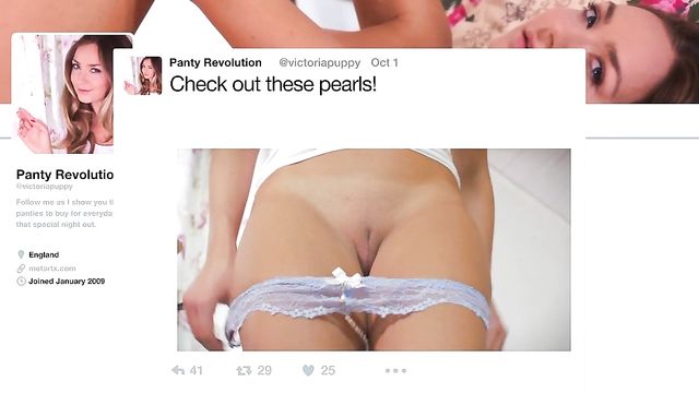 Description: Sexy blonde Cherry Kiss looks stunning in stockings and high heels as she checks out Victoria Puppy’s panty blog. She spreads her thighs to reveal her pussy, framed by open-crotch panties, and undresses as she watches the fun on her laptop. Pulling her panties tight to squeeze her plump pussy, she rubs her clit and sinks her fingers into her juicy slit. She smiles naughtily as she licks and sucks a big black dildo, and pushes it deep inside herself, gasping as it fills her. The irresistible beauty crouches to ride her sex toy harder, then lies back and masturbates to an intense orgasm.