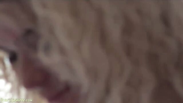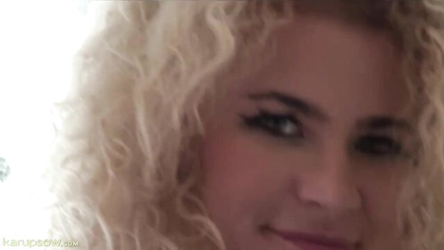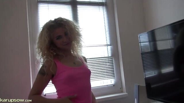 Curly-haired blonde in pink dress Angel Diamonds shows her pussy