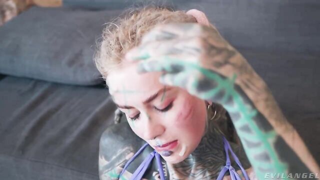 Description: Pretty-faced alt-girl Anuskatzz's tight body is elaborately covered in tattoos. The kinky vixen starts with a quick tease, shaking her ass and showing her chams. She strips off her clothes and crams a weird-looking alien dildo into her pussy, using her fingers to pry open her butthole. Holes fully prepped, Anuskatzz welcomes Darrell Deeps and Nelson Mandingo. She warms them up with slobbering blowjobs, soon hopping on Nelson's lap for some serious cunt pounding. The dudes take turns drilling her twat, and then they collaborate on a double penetration drilling! Anuskatzz moans through the wild threesome. Things intensify with hard double-anal reaming -- both big Black cocks cram her bunghole together! She gives ass-to-mouth head and poses her widely gaping rectum. The climax is a creamy cum facial. Anuskatzz swallows sperm.