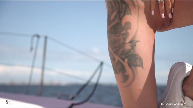 Description: This pouty siren will blow your mind. She is a divine mix of brunette hair, lean body, and detailed tattoos that make her unforgettable and irresistible. Video Release 669 is eternally spiced with the sultry bombshell who likes undressing for your eyes only. It all happens on a boat, on a beautiful summer day. It's hot outside, and as sunrays warm the blue water, the ravishing StasyQ model poses like a superstar. She wears a cute skirt and a neon top that hugs her firm breasts. It's not long before the vixen starts feeling the unbearable heat. That's when the striptease show starts to unravel. As the red sail dances in the wind, the stunning brunette takes her top off. The black bikini bottom holds on for a couple of more minutes, but it's not long before it hits the floor too. You will enjoy this steaming masterpiece.
