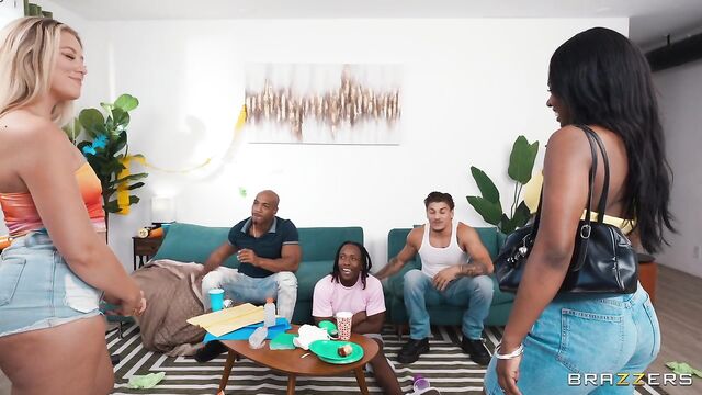 Description: The morning after a big frat party, a couple female partygoers are still hanging around but won't fuck the hungover frat dudes. The dudes’ flirty friend Liz Jordan kicks them out and offers herself up instead. What a good friend!