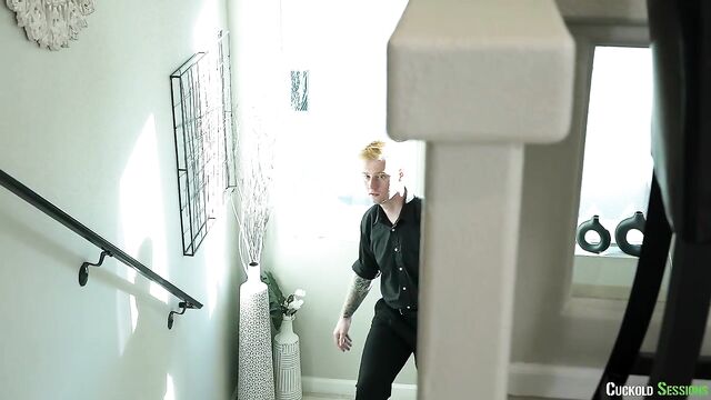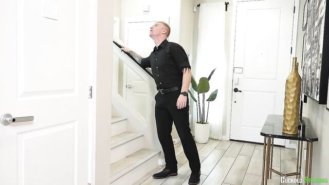 Description: Savanah Storm has been wanting to fuck her personal trainer for some time now and finally decides to bring him home when she thinks her husband is not there. She walks in immediately grabbing his cock and talking oh so dirty to her trainer Will Tile, not knowing that her Husband Silas is just around the corner in shock at her betrayal. Savanah drops to her knees to taste that giant cock slurping away and promising him that her husband is not there. Not knowing that now he is listening to her slutty behavior just around the corner. Off the dirty couple run upstairs and Silas the cuckolded husband moves closer to listen as they obviously move on to more dirty things. Taking off his shoes to be quiet he sneaks up the stairs to see what they are up to and gasps quietly when he does. By now Savanah has Will's cock deep inside her and begging for it to go deeper. Silas can not help but notice his own cock hardening watching them and takes a seat to whip it out and jack to the obscene show. Finally in the throws of ecstasy Savanah notices her Husband sitting there and recoils in shock. Silas approaches to confront them but with his own cock out and very hard his argument lacks merit. It's obvious that he is enjoying the show and Savanah gets right back to it taunting her husband with her slutty behavior. And when she tells Silas to get on his knees to lick her dirty used stretched out pussy she knows she can do this from now on anytime she likes. This deal is sealed when both men cover her in their cum but with Silas licking both loads up and coming up more to kiss his now Cuckoldress Wife.