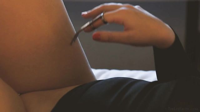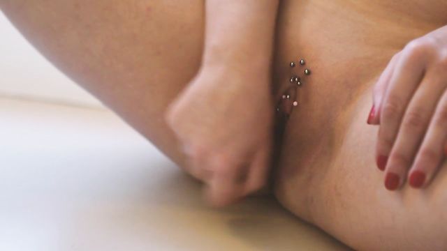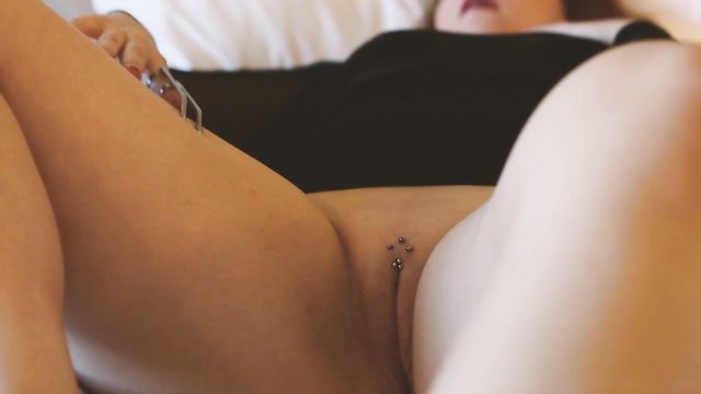 Description: Stunning redhead Kim Cums arrives at a cheap hotel room, elegant in a little black dress, skyscraper platforms with spike heels, and red lipstick. She slumps back on a single bed with plain white sheets, takes off her shoes to reveal cute bare feet, then lies back, rubbing her tits through the sheer top half of her dress. Within moments, she hikes up the skirt to expose a shaved, pierced pussy. She also puts on a kinky-looking finger-ring, tipped with two long, angled metal spikes, and tests these "claws" against her other manicured hand. Then she strokes the metal points against her thighs and splays her legs to flaunt even more pussy piercings as she moans with pleasure. She runs her finger along her slit, then strips off her dress to display a peachy ass. She lays a double-sided paddle, dildo and the claw-ring on the counter-table, then sits on it and takes off her bra to display pert, perfect breasts with multiple nipple piercings. As she massages her globes and tugs on her nipples, she talks dirty to herself, confirming her fetish for pain. Next, she uses the ring to tease them, pressing the spikes against her sensitive flesh as her fingers get busy in her pink. In need of a tender interlude, she takes the paddle and caresses the soft, fake fur-covered side, while talking to an imaginary Master. Obeying his orders, she turns around and begins to spank her butt, counting each stroke as it lands. Then she flips the paddle to use the harsher, metal-studded leather side. Soon, her cheeks are glowing pink and her juices are flowing Now, she takes her dildo – clear pink glass and double-ended – and talks dirty to "Sir" once more, as she plows her smooth snatch which is audibly and visibly creaming. Then she switches to using her hand to spank and rub her clit, pausing only to taste her juices off of her fingertips before she begs to cum. Clutching at her throat she teases herself to the brink of climax – then proves herself to be a good submissive by thanking her Master, even as she loses herself in the ecstasy of orgasm...