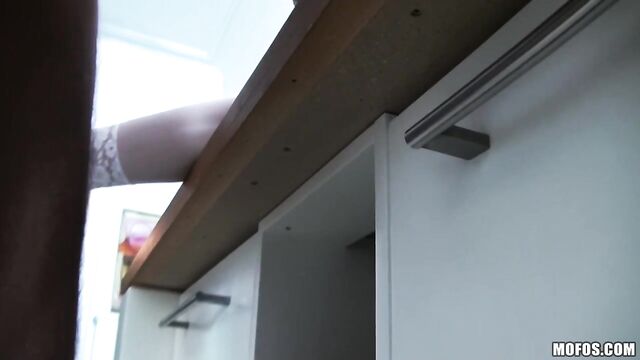 Description: Breathtaking April Blue answers the door to her beautiful home in white lingerie and high heels, then invites us inside. This white goddess with waist length black hair teases herself then shows us what she can do with cock on the kitchen counter.